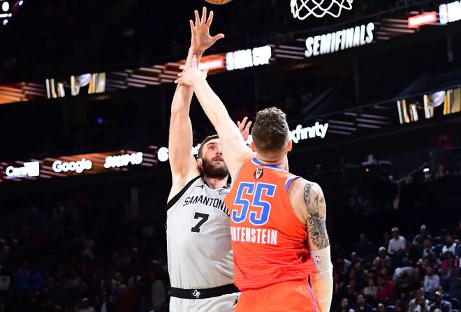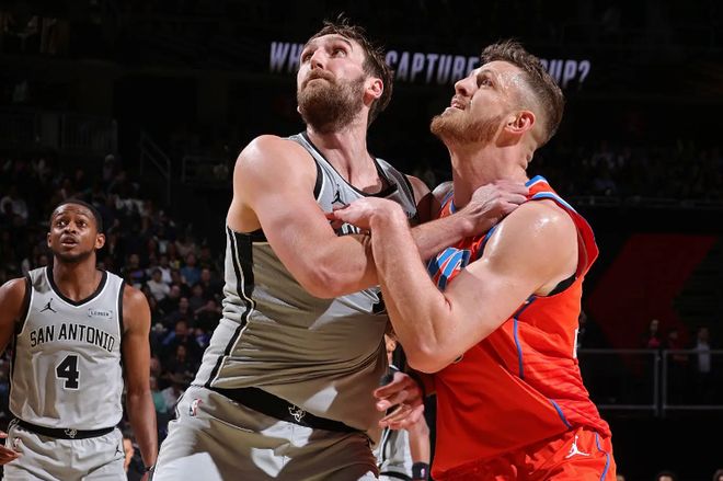 本場比賽中,馬刺雖然拿下了比賽的勝利,但是球隊的先發中鋒盧克-科內特(Luke Kornet)的表現其實是非常糟糕的。科內特全場出場24分21秒,投籃3中1,得到了2分8籃板1助攻1搶斷的數據,其中還包括了5個前場籃板,還有1次犯規,正負值為-15。科內特在進攻端的效率非常一般,他的得分能力并不理想,他也很難在對手內線制造基本的威脅。科內特搶下了一些前場籃板,但是他也沒有辦法將這些前場籃板轉化成有效進攻。事實上,科內特在防守端的表現也是糟糕透頂的,他也同樣沒有辦法發揮出自己在防守端的作用,而且可以說他是被切特-霍姆格倫(Chet Holmgren)各種打爆。作為球隊的先發中鋒,這樣的表現顯然是令人非常失望的。